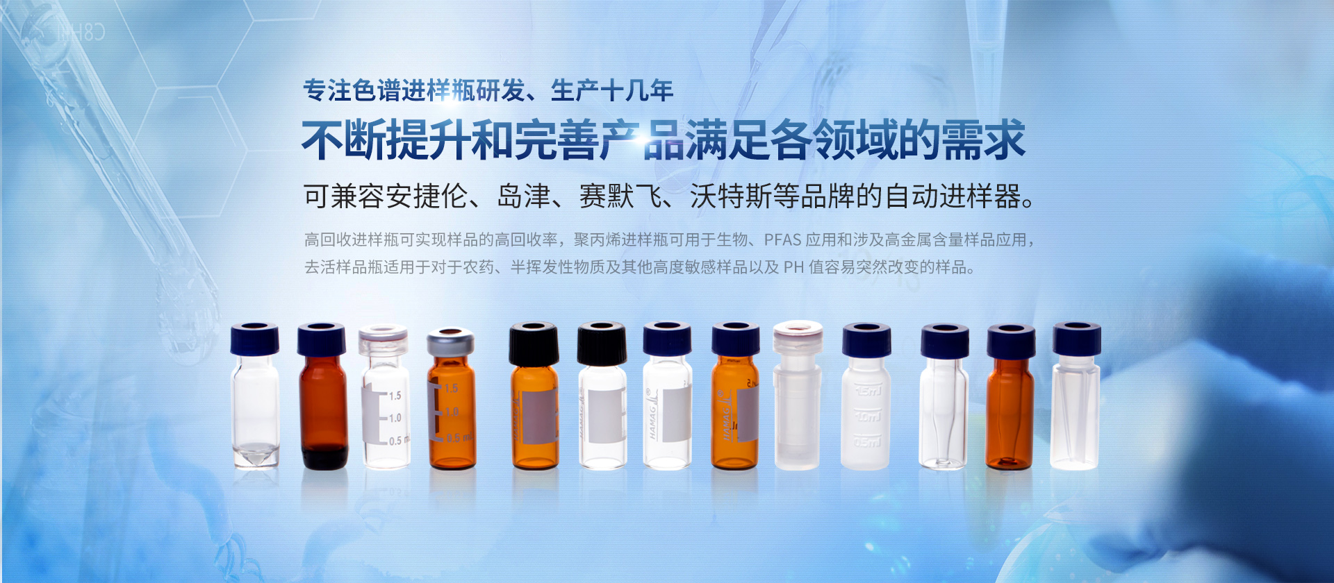 浙江哈邁科技有限公司(簡稱HAMAG),成立于2005年,總部位于美麗的海濱城市寧波,是中國優(yōu)質(zhì)色譜進(jìn)樣瓶、樣品瓶供應(yīng)商,是一家專業(yè)從事色譜耗材的科研、設(shè)計(jì)、生產(chǎn)、銷售和系統(tǒng)集成為一體的生產(chǎn)型企業(yè)。經(jīng)過十幾年的研發(fā)與努力,通過和國內(nèi)外多個(gè)科研部門,浙江大學(xué)理工學(xué)院,同時(shí)與品牌:安捷倫、沃特世、島津等公司的技術(shù)交流與學(xué)習(xí),我們成功的研制開發(fā)出實(shí)驗(yàn)室分析設(shè)備專用的各種型號的自動進(jìn)樣瓶、頂空瓶及其配套蓋墊;特氟龍與硅膠復(fù)合墊片;特氟龍/硅膠制品;創(chuàng)新型固相萃取儀;針式過濾器等幾十種實(shí)驗(yàn)室耗材及關(guān)聯(lián)產(chǎn)品...
